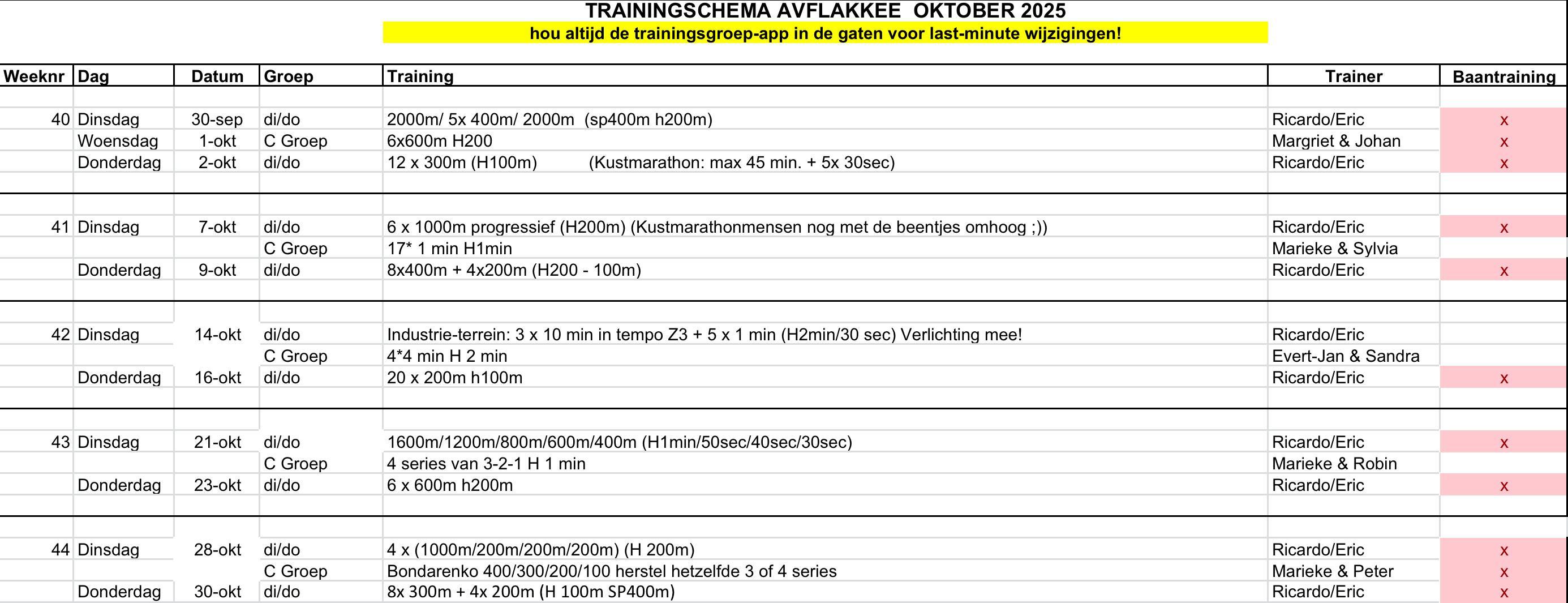 Hieronder vind je het trainingsschema van de maand oktober. Houd altijd de trainingsgroep in de gaten voor de laatste wijzigingen.